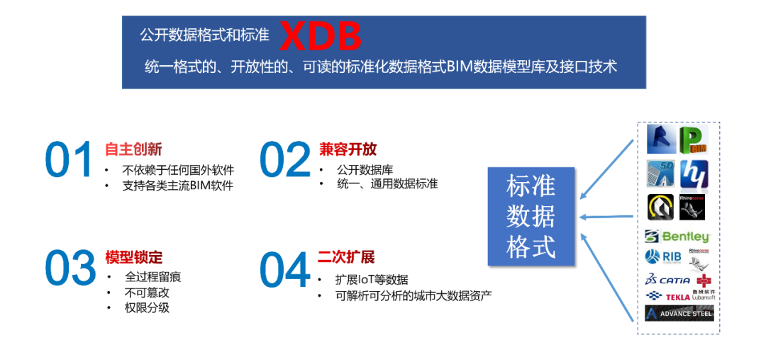 形成了以BIM審查技術標準、模型交付標準、數據標準為基礎的標準體系,各類主流軟件設計的BIM模型通過統一的標準格式XDB載入系統進行審查,并完成后續的數據管理業務,全過程權限分級、批注留痕、不可篡改。
