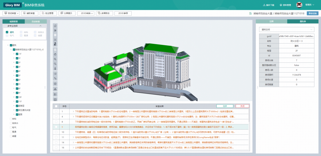 系統中的BIM輔助審查工具軟件,可實現對建筑、結構、水、暖、電、人防、消防、節能及裝配式等專業的三維輔助審查,并可實現對建筑消防及結構專業的BIM智能審查,審查范圍包含了以上專業的幾十本常用規范,審查意見經編輯后可添加至批注管理系統,自動生成審查報告。
