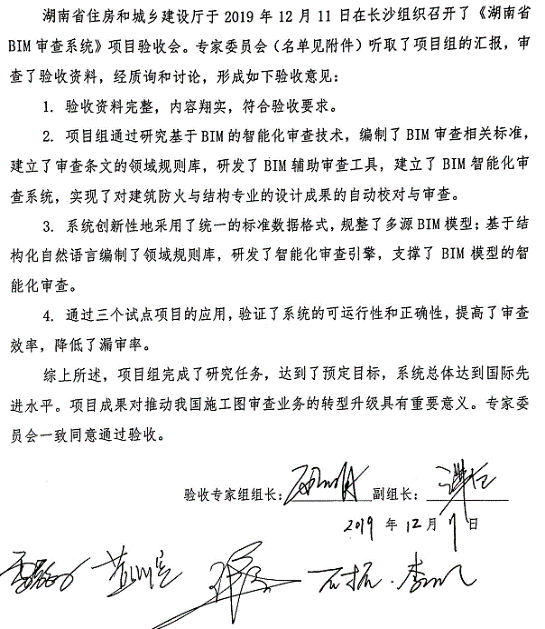 2019年12月系統通過了專家評審驗收。由清華大學軟件學院副院長顧明、全國勘察設計大師謝衛等多名行業權威專家組成的驗收專家委員會一致認為,湖南省開發完成的省級BIM審查系統“國內首創、達到國際先進水平”,具有較高的推廣應用價值。