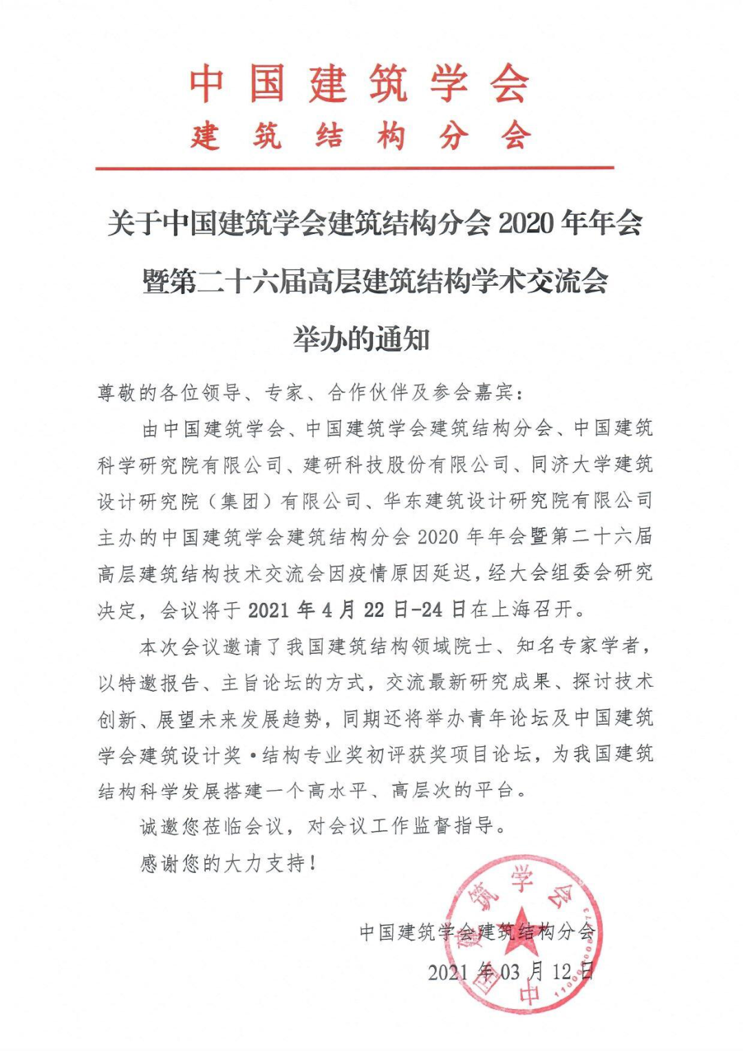 由中國建筑學會、中國建筑學會建筑結構分會、中國建筑科學研究院有限公司、建研科技股份有限公司、同濟大學建筑設計研究院(集團)有限公司、華東建筑設計研究院有限公司主辦的中國建筑學會建筑結構分會2020年年會暨第二十六屆高層建筑結構技術交流會因疫情原因延遲,經大會組委會研究決定,會議將于2021年4月22日-24日在上海召開。